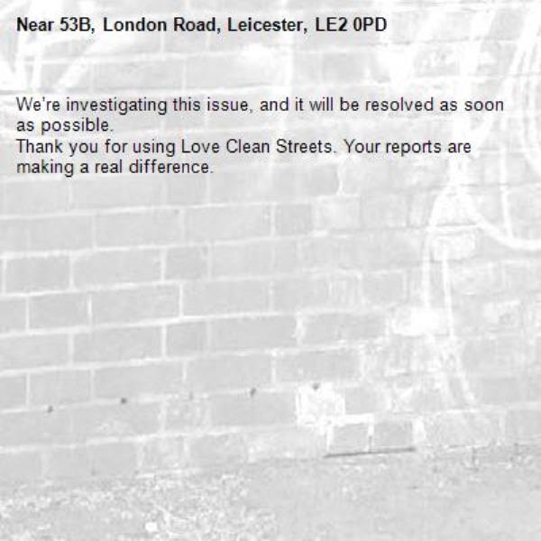-53B, London Road, Leicester, LE2 0PD 09/03/2026 11:34 We’re investigating this issue, and it will be resolved as soon as possible. Thank you for using Love Clean Streets. Your reports are making a real difference.