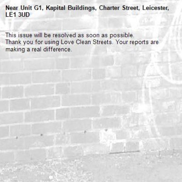 -Unit G1, Kapital Buildings, Charter Street, Leicester, LE1 3UD 23/04/2026 10:47 This issue will be resolved as soon as possible. Thank you for using Love Clean Streets. Your reports are making a real difference.