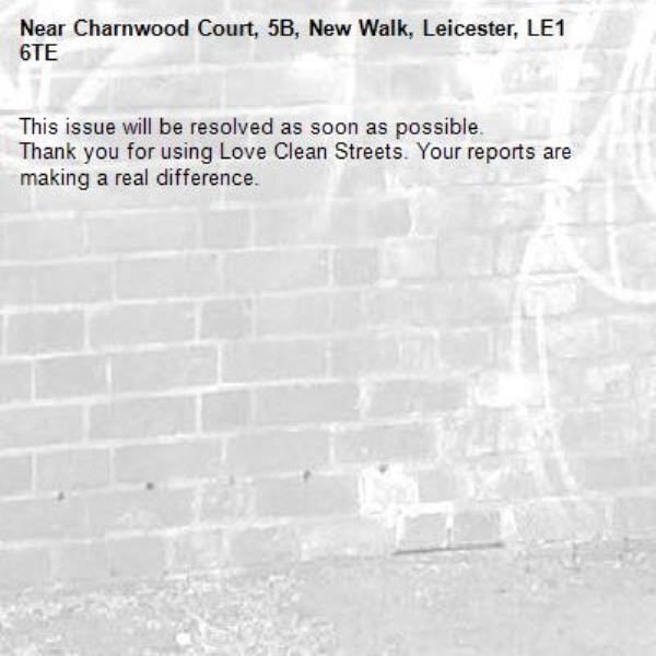 -Charnwood Court, 5B, New Walk, Leicester, LE1 6TE 14/10/2025 08:51 This issue will be resolved as soon as possible. Thank you for using Love Clean Streets. Your reports are making a real difference.