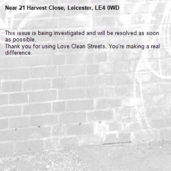 -21 Harvest Close, Leicester, LE4 0WD 21/01/2026 08:08 This issue is being investigated and will be resolved as soon as possible. Thank you for using Love Clean Streets. You’re making a real difference.