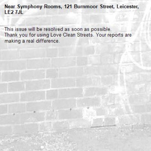 -Symphony Rooms, 121 Burnmoor Street, Leicester, LE2 7JL 03/04/2026 09:01 This issue will be resolved as soon as possible. Thank you for using Love Clean Streets. Your reports are making a real difference.
