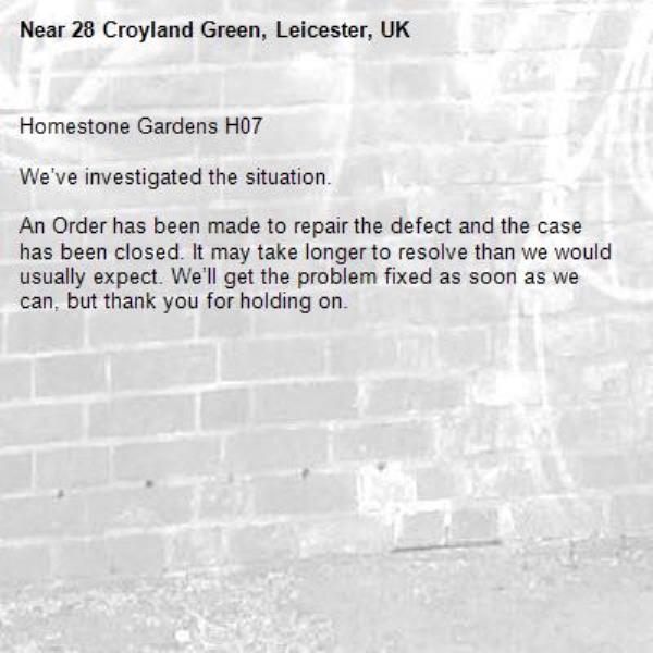 Closed Homestone Gardens H07 We’ve investigated the situation. An Order has been made to repair the defect and the case has been closed. It may take longer to resolve than we would usually expect. We’ll get the problem fixed as soon as we can, but thank you for holding on.