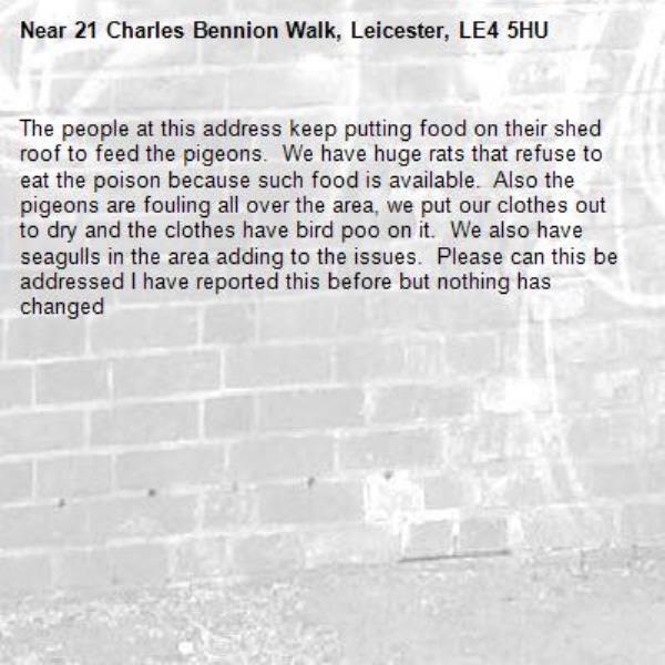 The people at this address keep putting food on their shed roof to feed the pigeons. We have huge rats that refuse to eat the poison because such food is available. Also the pigeons are fouling all over the area, we put our clothes out to dry and the clothes have bird poo on it. We also have seagulls in the area adding to the issues. Please can this be addressed I have reported this before but nothing has changed