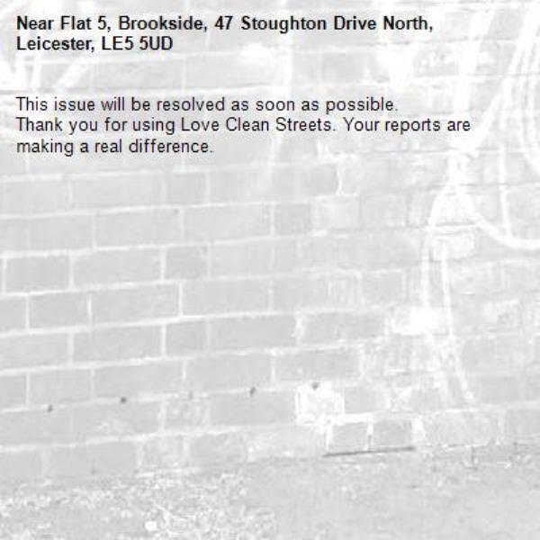 -Flat 5, Brookside, 47 Stoughton Drive North, Leicester, LE5 5UD 24/04/2026 07:30 This issue will be resolved as soon as possible. Thank you for using Love Clean Streets. Your reports are making a real difference.