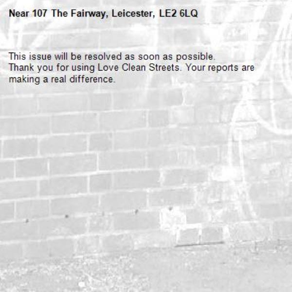 -107 The Fairway, Leicester, LE2 6LQ 18/03/2026 12:46 This issue will be resolved as soon as possible. Thank you for using Love Clean Streets. Your reports are making a real difference.