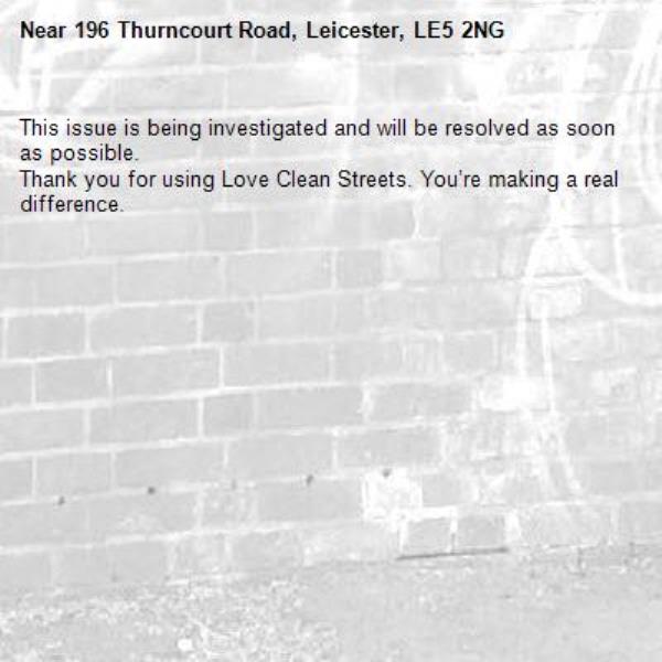 -196 Thurncourt Road, Leicester, LE5 2NG 27/10/2025 08:26 This issue is being investigated and will be resolved as soon as possible. Thank you for using Love Clean Streets. You’re making a real difference.