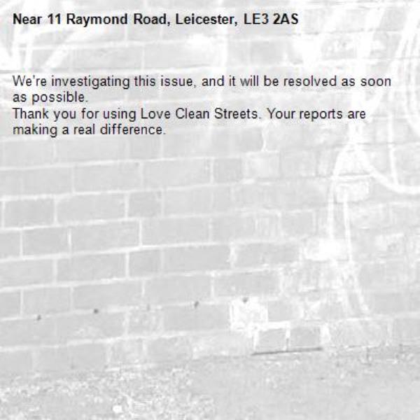 -11 Raymond Road, Leicester, LE3 2AS 10/12/2025 14:12 We’re investigating this issue, and it will be resolved as soon as possible. Thank you for using Love Clean Streets. Your reports are making a real difference.