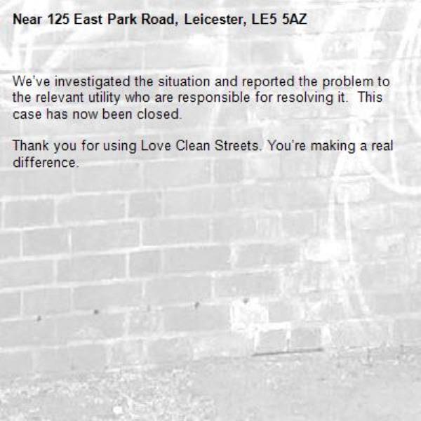 -125 East Park Road, Leicester, LE5 5AZ 13/03/2026 10:19 We’ve investigated the situation and reported the problem to the relevant utility who are responsible for resolving it. This case has now been closed. Thank you for using Love Clean Streets. You’re making a real difference.