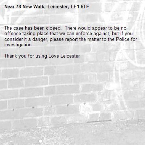 -78 New Walk, Leicester, LE1 6TF 30/01/2026 15:16 The case has been closed. There would appear to be no offence taking place that we can enforce against, but if you consider it a danger, please report the matter to the Police for investigation. Thank you for using Love Leicester.