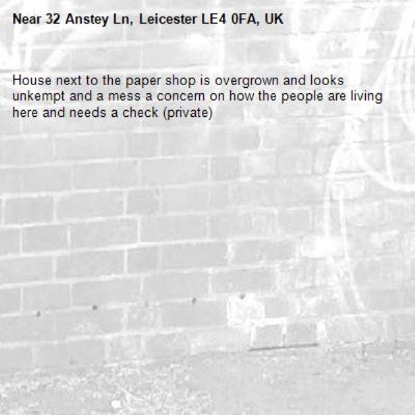 House next to the paper shop is overgrown and looks unkempt and a mess a concern on how the people are living here and needs a check (private)