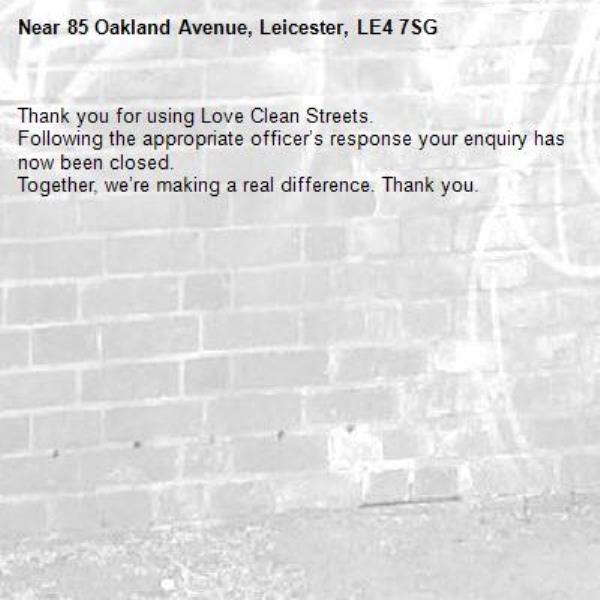 -85 Oakland Avenue, Leicester, LE4 7SG 29/04/2026 08:10 Thank you for using Love Clean Streets.
