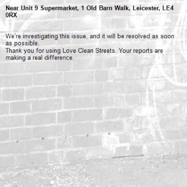 -Unit 9 Supermarket, 1 Old Barn Walk, Leicester, LE4 0RX 29/01/2026 15:40 We’re investigating this issue, and it will be resolved as soon as possible. Thank you for using Love Clean Streets. Your reports are making a real difference.