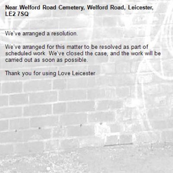 -Welford Road Cemetery, Welford Road, Leicester, LE2 7SQ 08/10/2025 12:31 We’ve arranged a resolution. We’ve arranged for this matter to be resolved as part of scheduled work. We’ve closed the case, and the work will be carried out as soon as possible. Thank you for using Love Leicester