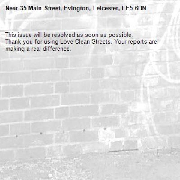 -35 Main Street, Evington, Leicester, LE5 6DN 18/11/2025 08:29 This issue will be resolved as soon as possible. Thank you for using Love Clean Streets. Your reports are making a real difference.