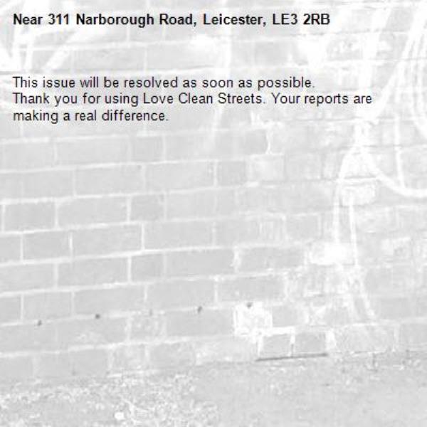 -311 Narborough Road, Leicester, LE3 2RB 19/02/2026 07:18 This issue will be resolved as soon as possible. Thank you for using Love Clean Streets. Your reports are making a real difference.
