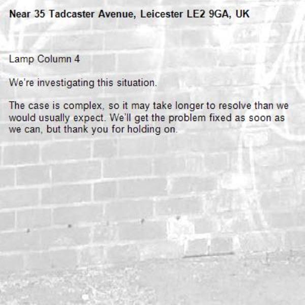 A brand new street light has been erected by yourselfs out side number 35 tadcaster avenue but it has never been switched on for some unknown reason , so we on the oppersite side of the road are in nearly total darkness , so can this light be switched on before another accident happens please .