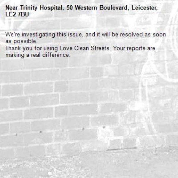-Trinity Hospital, 50 Western Boulevard, Leicester, LE2 7BU 04/03/2026 14:12 We’re investigating this issue, and it will be resolved as soon as possible. Thank you for using Love Clean Streets. Your reports are making a real difference.