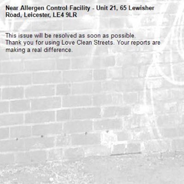 -Allergen Control Facility - Unit 21, 65 Lewisher Road, Leicester, LE4 9LR 23/03/2026 08:05 This issue will be resolved as soon as possible. Thank you for using Love Clean Streets. Your reports are making a real difference.