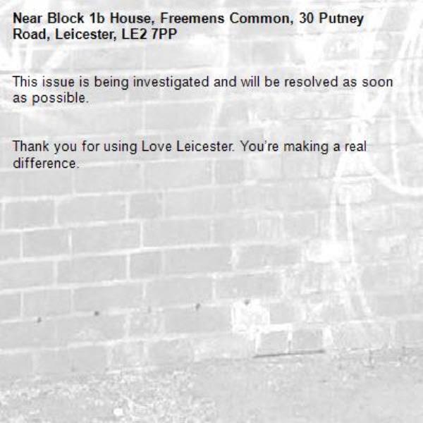 -Block 1b House, Freemens Common, 30 Putney Road, Leicester, LE2 7PP 13/12/2025 14:14 This issue is being investigated and will be resolved as soon as possible. Thank you for using Love Leicester. You’re making a real difference.