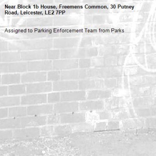 Assigned to Parking Enforcement Team from Parks-Block 1b House, Freemens Common, 30 Putney Road, Leicester, LE2 7PP 12/12/2025 14:54 Assigned to Parking Enforcement Team from Parks