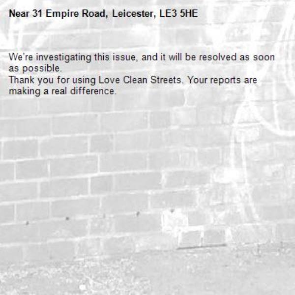 -31 Empire Road, Leicester, LE3 5HE 06/03/2026 10:14 We’re investigating this issue, and it will be resolved as soon as possible. Thank you for using Love Clean Streets. Your reports are making a real difference.