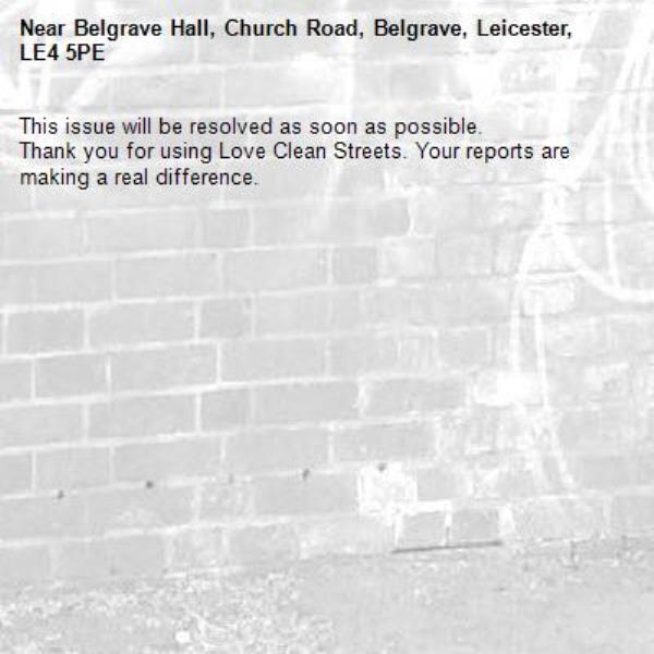 -Belgrave Hall, Church Road, Belgrave, Leicester, LE4 5PE 09/04/2026 07:32 This issue will be resolved as soon as possible. Thank you for using Love Clean Streets. Your reports are making a real difference.