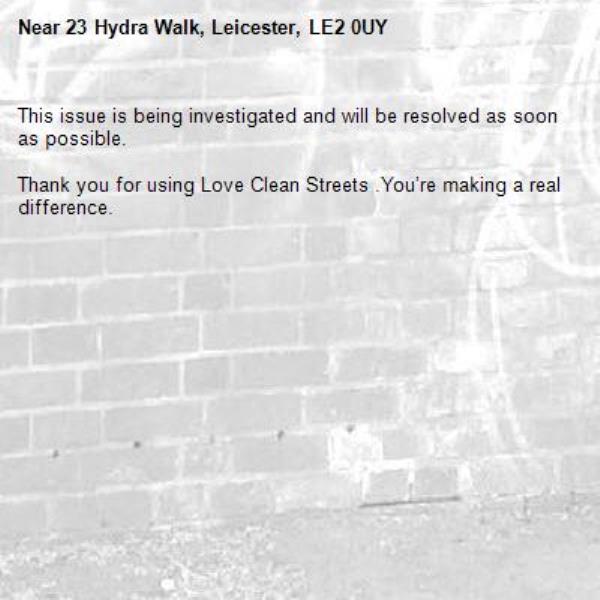-23 Hydra Walk, Leicester, LE2 0UY 30/03/2026 12:40 This issue is being investigated and will be resolved as soon as possible. Thank you for using Love Clean Streets .You’re making a real difference.