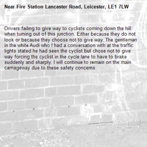Drivers failing to give way to cyclists coming down the hill when turning out of this junction. Either because they do not look or because they choose not to give way. The gentleman in the white Audi who I had a conversation with at the traffic lights stated he had seen the cyclist but chose not to give way forcing the cyclist in the cycle lane to have to brake suddenly and sharply. I will continue to remain on the main carriageway due to these safety concerns