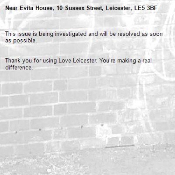 -Evita House, 10 Sussex Street, Leicester, LE5 3BF 07/02/2026 09:11 This issue is being investigated and will be resolved as soon as possible. Thank you for using Love Leicester. You’re making a real difference.