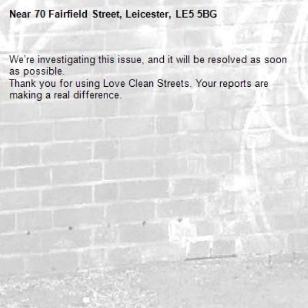 -70 Fairfield Street, Leicester, LE5 5BG 24/11/2025 14:44 We’re investigating this issue, and it will be resolved as soon as possible. Thank you for using Love Clean Streets. Your reports are making a real difference.