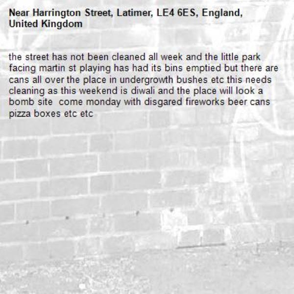 the street has not been cleaned all week and the little park facing martin st playing has had its bins emptied but there are cans all over the place in undergrowth bushes etc this needs cleaning as this weekend is diwali and the place will look a bomb site come monday with disgared fireworks beer cans pizza boxes etc etc