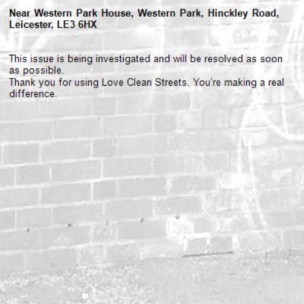 -Western Park House, Western Park, Hinckley Road, Leicester, LE3 6HX 14/04/2026 07:41 This issue is being investigated and will be resolved as soon as possible. Thank you for using Love Clean Streets. You’re making a real difference.