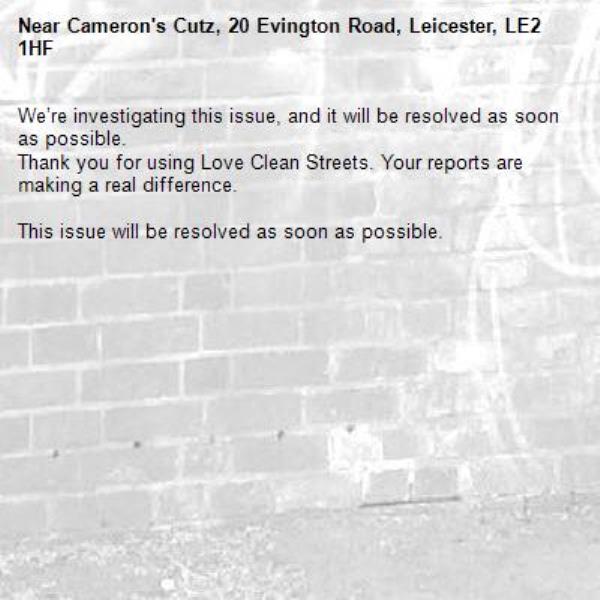 -Cameron's Cutz, 20 Evington Road, Leicester, LE2 1HF 04/04/2026 10:36 We’re investigating this issue, and it will be resolved as soon as possible. Thank you for using Love Clean Streets. Your reports are making a real difference. This issue will be resolved as soon as possible.