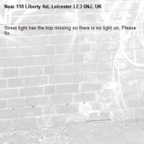 Street light has the top missing so there is no light on. Please fix