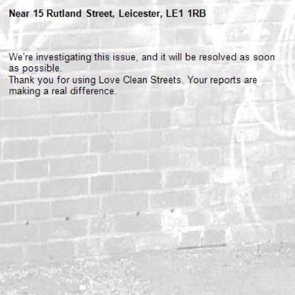 -15 Rutland Street, Leicester, LE1 1RB 17/03/2026 09:43 We’re investigating this issue, and it will be resolved as soon as possible. Thank you for using Love Clean Streets. Your reports are making a real difference.