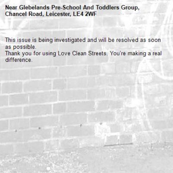 -Glebelands Pre-School And Toddlers Group, Chancel Road, Leicester, LE4 2WF 07/11/2025 09:03 This issue is being investigated and will be resolved as soon as possible. Thank you for using Love Clean Streets. You’re making a real difference.