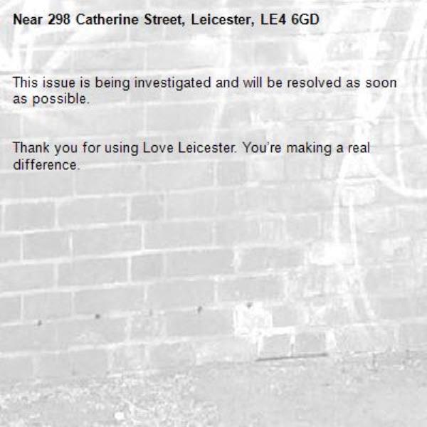 -298 Catherine Street, Leicester, LE4 6GD 21/11/2025 12:26 This issue is being investigated and will be resolved as soon as possible. Thank you for using Love Leicester. You’re making a real difference.
