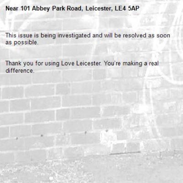 -101 Abbey Park Road, Leicester, LE4 5AP 06/04/2026 15:23 This issue is being investigated and will be resolved as soon as possible. Thank you for using Love Leicester. You’re making a real difference.