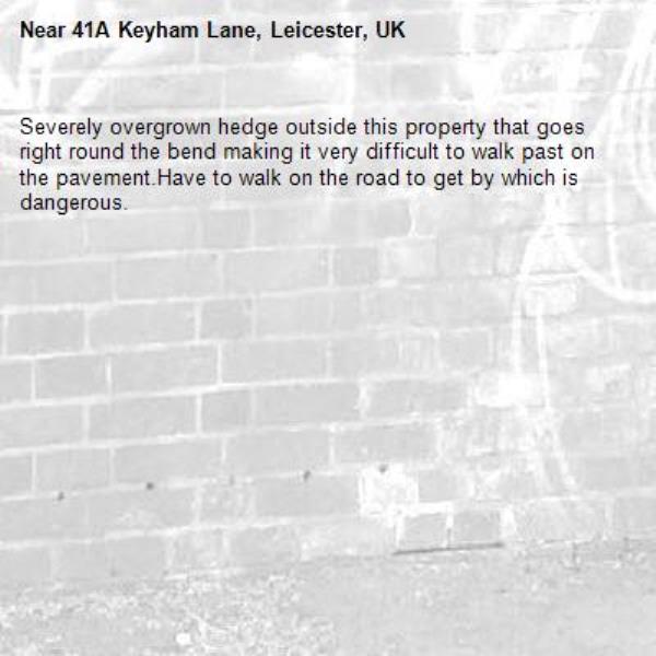 Severely overgrown hedge outside this property that goes right round the bend making it very difficult to walk past on the pavement.Have to walk on the road to get by which is dangerous.