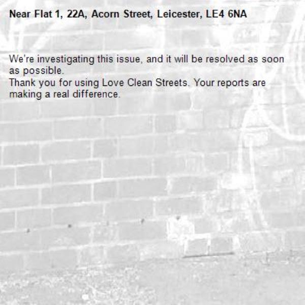 -Flat 1, 22A, Acorn Street, Leicester, LE4 6NA 27/03/2026 11:42 We’re investigating this issue, and it will be resolved as soon as possible. Thank you for using Love Clean Streets. Your reports are making a real difference.
