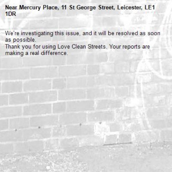 -Mercury Place, 11 St George Street, Leicester, LE1 1DR 24/04/2026 08:21 We’re investigating this issue, and it will be resolved as soon as possible. Thank you for using Love Clean Streets. Your reports are making a real difference.