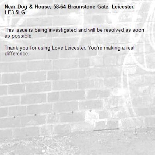 -Dog & House, 58-64 Braunstone Gate, Leicester, LE3 5LG 02/03/2026 16:49 This issue is being investigated and will be resolved as soon as possible. Thank you for using Love Leicester. You’re making a real difference.
