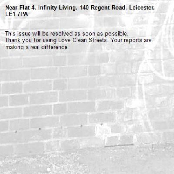 -Flat 4, Infinity Living, 140 Regent Road, Leicester, LE1 7PA 04/04/2026 10:58 This issue will be resolved as soon as possible. Thank you for using Love Clean Streets. Your reports are making a real difference.