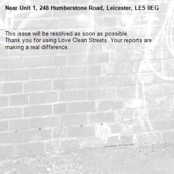 -Unit 1, 248 Humberstone Road, Leicester, LE5 0EG 02/12/2025 07:39 This issue will be resolved as soon as possible. Thank you for using Love Clean Streets. Your reports are making a real difference.