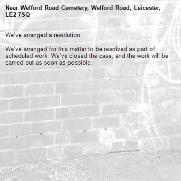 -Welford Road Cemetery, Welford Road, Leicester, LE2 7SQ 16/10/2025 10:03 We’ve arranged a resolution. We’ve arranged for this matter to be resolved as part of scheduled work. We’ve closed the case, and the work will be carried out as soon as possible.
