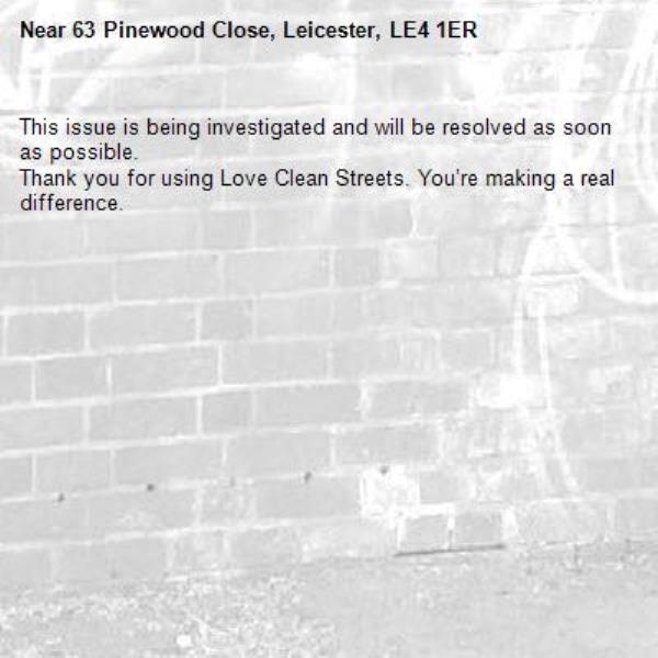-63 Pinewood Close, Leicester, LE4 1ER 02/04/2026 08:07 This issue is being investigated and will be resolved as soon as possible. Thank you for using Love Clean Streets. You’re making a real difference.