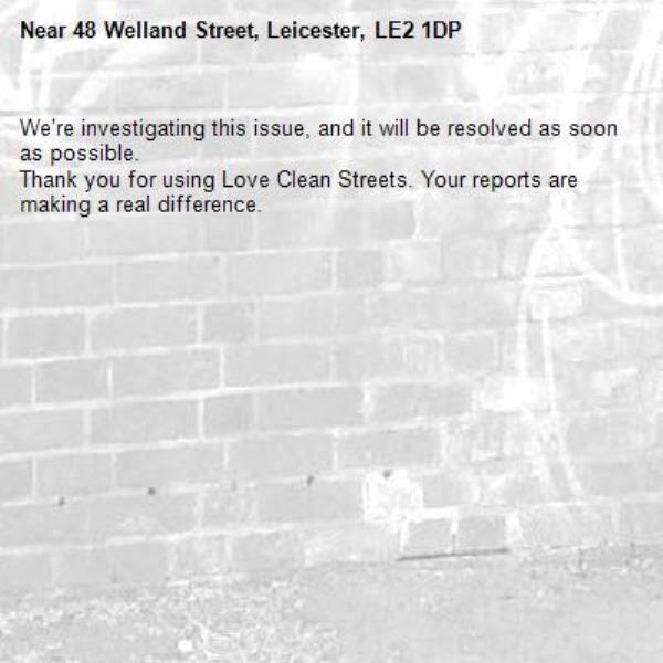 -48 Welland Street, Leicester, LE2 1DP 30/03/2026 13:48 We’re investigating this issue, and it will be resolved as soon as possible. Thank you for using Love Clean Streets. Your reports are making a real difference.