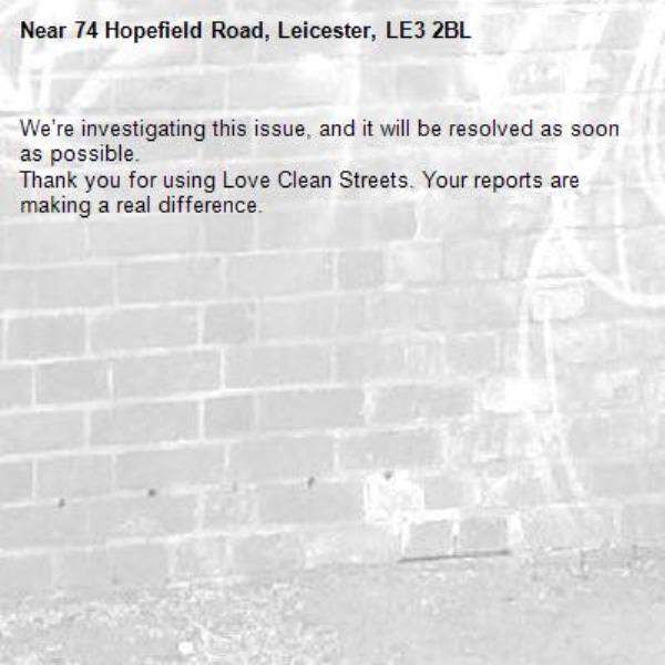 -74 Hopefield Road, Leicester, LE3 2BL 10/12/2025 13:56 We’re investigating this issue, and it will be resolved as soon as possible. Thank you for using Love Clean Streets. Your reports are making a real difference.