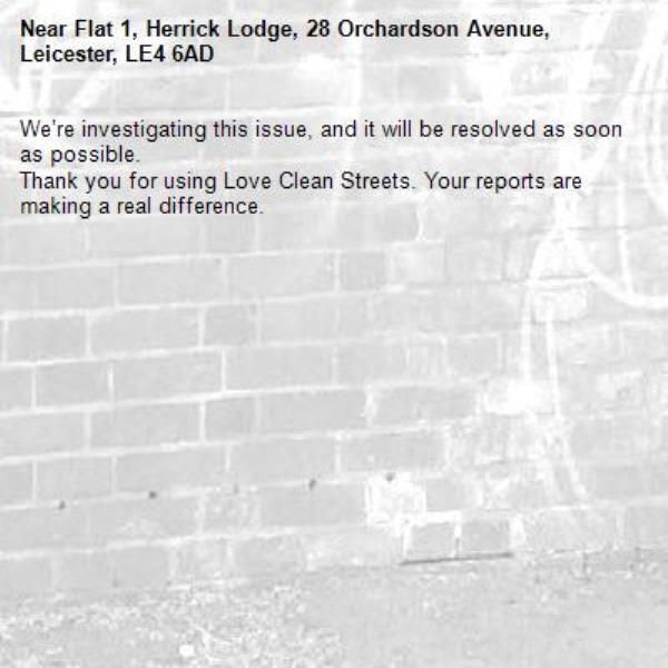 -Flat 1, Herrick Lodge, 28 Orchardson Avenue, Leicester, LE4 6AD 02/10/2025 14:53 We’re investigating this issue, and it will be resolved as soon as possible. Thank you for using Love Clean Streets. Your reports are making a real difference.