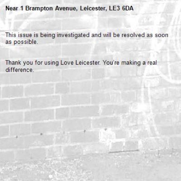 -1 Brampton Avenue, Leicester, LE3 6DA 25/03/2026 17:33 This issue is being investigated and will be resolved as soon as possible. Thank you for using Love Leicester. You’re making a real difference.